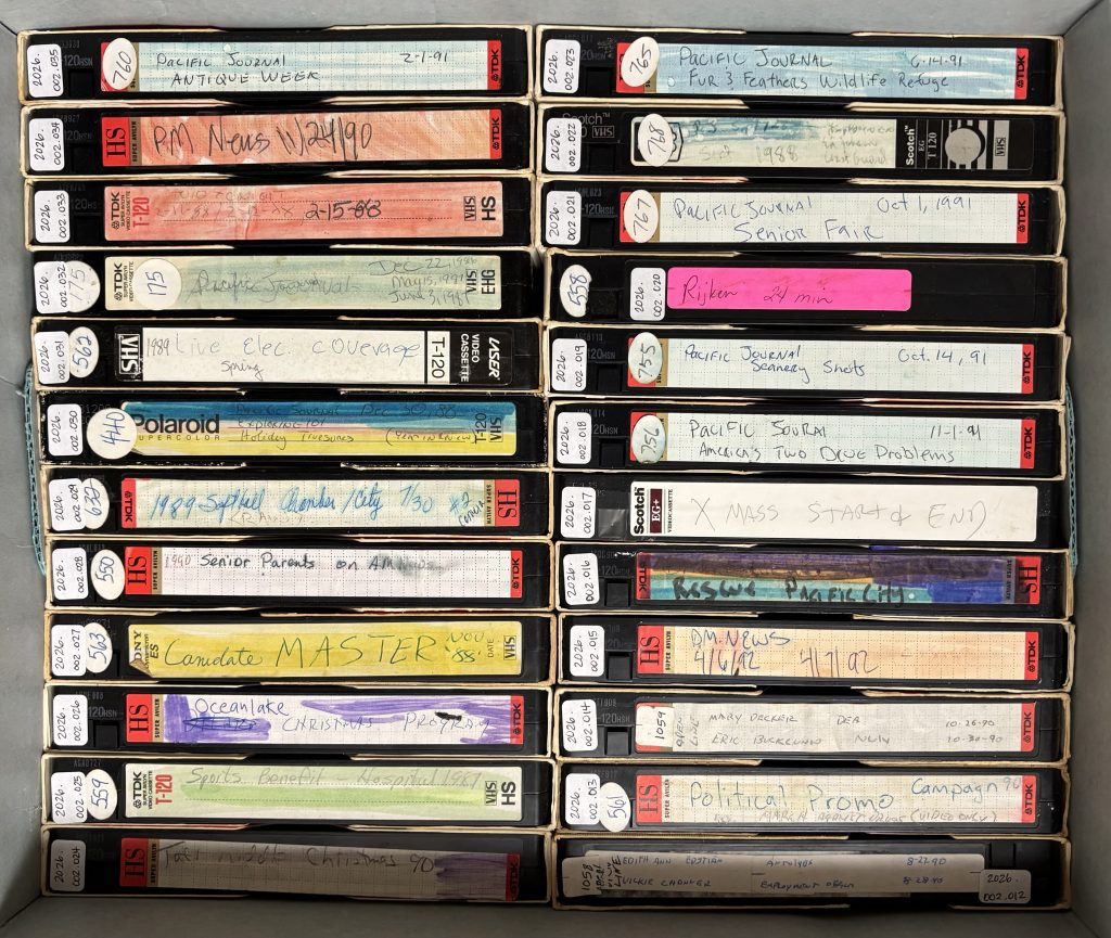 Did you know that Lincoln City used to have their very own TV station? From the late 1980s through the 1990s, Lincoln City’s community news program TV 10 captured the people, places, and turning points that shaped our coast. Roger Robertson ran the station, and recently he and his wife Pat donated more than 270 VHS tapes from the TV 10 archive to NLCHM. These original tapes hold rare interviews with state leaders, local officials, scientists, educators, and business owners, alongside on-the-ground coverage of community life and rare footage of Highway 101 and the Oregon Coast as they were 30–40 years ago.